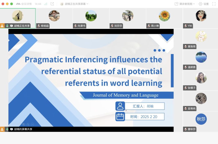 2025年2月20日下午,必赢bwin官网语言认知科学研究团队在线上举行了本年度第一次科研例会。本次科研例会主要围绕“语用层面的词汇学习”及“R语言基础知识学习及数据可视化”两部分展开,分别由胡楠博士和23级翻译专业硕士生杨铭超同学进行汇报。本次例会由团队负责人向课书博士主持,语言认知科学研究团队主要成员及部分硕士生参加了本次例会。